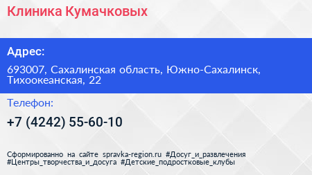 Клиника Кумачковых по адресу 693007, Сахалинская область, Южно-Сахалинск, Тихоокеанская, 22 в дальнейшем Организация, размещена в следующих категориях:
