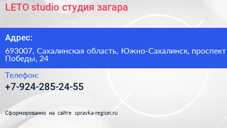 LETO studio, студия загара по адресу 693007, Сахалинская область, Южно-Сахалинск, проспект Победы, 24 в дальнейшем Организация, размещена в следующих категориях: