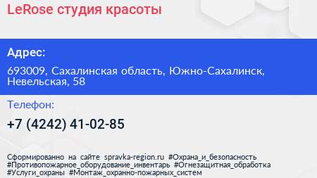 LeRose, студия красоты по адресу 693009, Сахалинская область, Южно-Сахалинск, Невельская, 58 в дальнейшем Организация, размещена в следующих категориях: