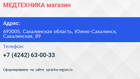 МЕДТЕХНИКА, магазин по адресу 693005, Сахалинская область, Южно-Сахалинск, Сахалинская, 89 в дальнейшем Организация, размещена в следующих категориях: