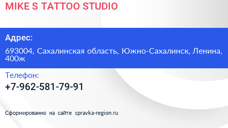 MIKE`S TATTOO STUDIO по адресу 693004, Сахалинская область, Южно-Сахалинск, Ленина, 400ж в дальнейшем Организация, размещена в следующих категориях: