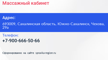 Массажный кабинет по адресу 693009, Сахалинская область, Южно-Сахалинск, Чехова, 29а в дальнейшем Организация, размещена в следующих категориях: