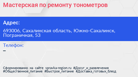Мастерская по ремонту тонометров по адресу 693006, Сахалинская область, Южно-Сахалинск, Пограничная, 53 в дальнейшем Организация, размещена в следующих категориях: