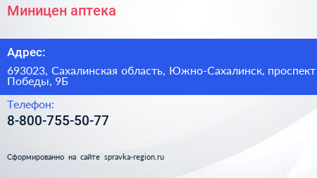 Миницен, аптека по адресу 693023, Сахалинская область, Южно-Сахалинск, проспект Победы, 9Б в дальнейшем Организация, размещена в следующих категориях: