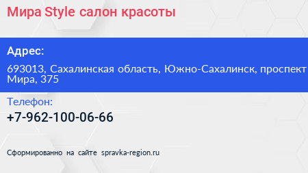 Мира Style, салон красоты по адресу 693013, Сахалинская область, Южно-Сахалинск, проспект Мира, 375 в дальнейшем Организация, размещена в следующих категориях: