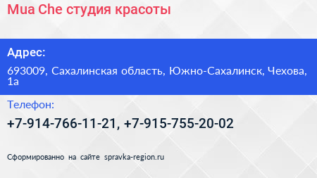 Mua Che, студия красоты по адресу 693009, Сахалинская область, Южно-Сахалинск, Чехова, 1а в дальнейшем Организация, размещена в следующих категориях: