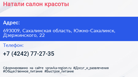 Натали, салон красоты по адресу 693009, Сахалинская область, Южно-Сахалинск, Дзержинского, 22 в дальнейшем Организация, размещена в следующих категориях: