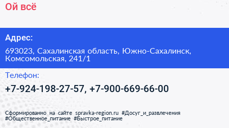 Ой, всё! по адресу 693023, Сахалинская область, Южно-Сахалинск, Комсомольская, 241/1 в дальнейшем Организация, размещена в следующих категориях: