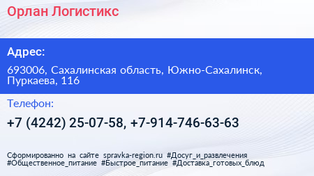 Орлан Логистикс по адресу 693006, Сахалинская область, Южно-Сахалинск, Пуркаева, 116 в дальнейшем Организация, размещена в следующих категориях: