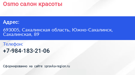 Osmo, салон красоты по адресу 693005, Сахалинская область, Южно-Сахалинск, Сахалинская, 89 в дальнейшем Организация, размещена в следующих категориях: