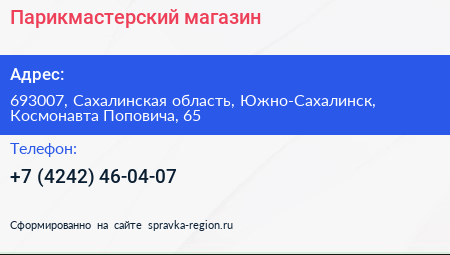 Парикмастерский магазин по адресу 693007, Сахалинская область, Южно-Сахалинск, Космонавта Поповича, 65 в дальнейшем Организация, размещена в следующих категориях: