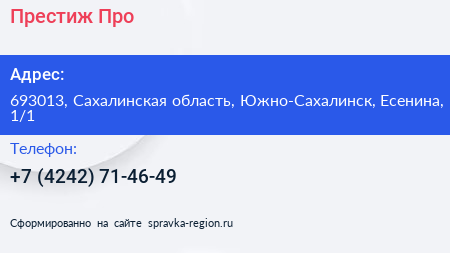 Престиж Про по адресу 693013, Сахалинская область, Южно-Сахалинск, Есенина, 1/1 в дальнейшем Организация, размещена в следующих категориях: