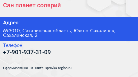 Сан планет, солярий по адресу 693010, Сахалинская область, Южно-Сахалинск, Сахалинская, 2 в дальнейшем Организация, размещена в следующих категориях: