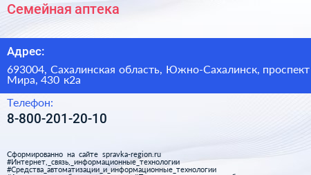 Семейная аптека по адресу 693004, Сахалинская область, Южно-Сахалинск, проспект Мира, 430 к2а в дальнейшем Организация, размещена в следующих категориях: