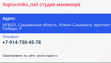Ssprocenko_nail, студия маникюра по адресу 693023, Сахалинская область, Южно-Сахалинск, проспект Победы, 9 в дальнейшем Организация, размещена в следующих категориях: