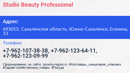 Studio Beauty Professional по адресу 693013, Сахалинская область, Южно-Сахалинск, Есенина, 13 в дальнейшем Организация, размещена в следующих категориях: