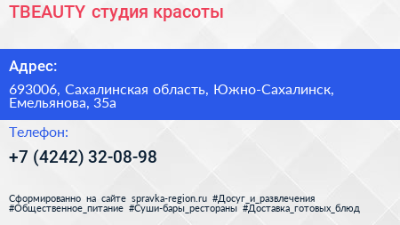 TBEAUTY, студия красоты по адресу 693006, Сахалинская область, Южно-Сахалинск, Емельянова, 35а в дальнейшем Организация, размещена в следующих категориях: