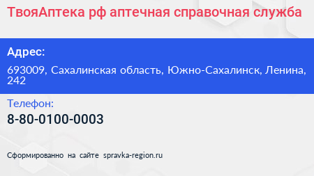 ТвояАптека.рф, аптечная справочная служба по адресу 693009, Сахалинская область, Южно-Сахалинск, Ленина, 242 в дальнейшем Организация, размещена в следующих категориях: