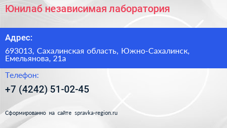 Юнилаб, независимая лаборатория по адресу 693013, Сахалинская область, Южно-Сахалинск, Емельянова, 21а в дальнейшем Организация, размещена в следующих категориях: