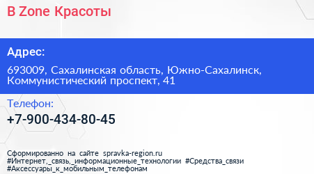 В Zone Красоты по адресу 693009, Сахалинская область, Южно-Сахалинск, Коммунистический проспект, 41 в дальнейшем Организация, размещена в следующих категориях: