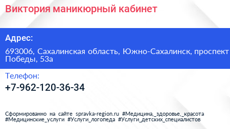 Виктория, маникюрный кабинет по адресу 693006, Сахалинская область, Южно-Сахалинск, проспект Победы, 53а в дальнейшем Организация, размещена в следующих категориях: