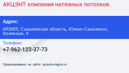 АКЦЭНТ, компания натяжных потолков по адресу 693005, Сахалинская область, Южно-Сахалинск, Холмская, 4 в дальнейшем Организация, размещена в следующих категориях: