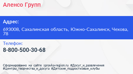Аленсо Групп по адресу 693008, Сахалинская область, Южно-Сахалинск, Чехова, 78 в дальнейшем Организация, размещена в следующих категориях: