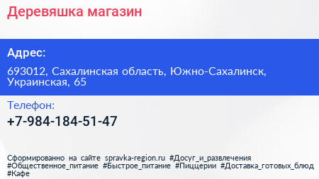 Деревяшка, магазин по адресу 693012, Сахалинская область, Южно-Сахалинск, Украинская, 65 в дальнейшем Организация, размещена в следующих категориях:
