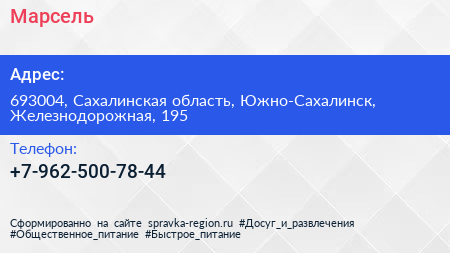 Марсель по адресу 693004, Сахалинская область, Южно-Сахалинск, Железнодорожная, 195 в дальнейшем Организация, размещена в следующих категориях: