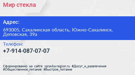 Мир стекла по адресу 693005, Сахалинская область, Южно-Сахалинск, Деповская, 39а в дальнейшем Организация, размещена в следующих категориях: