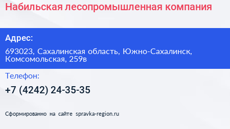 Набильская лесопромышленная компания по адресу 693023, Сахалинская область, Южно-Сахалинск, Комсомольская, 259в в дальнейшем Организация, размещена в следующих категориях: