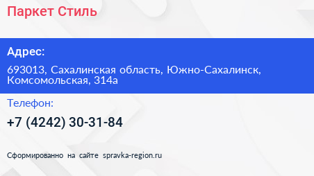 Паркет Стиль по адресу 693013, Сахалинская область, Южно-Сахалинск, Комсомольская, 314а в дальнейшем Организация, размещена в следующих категориях: