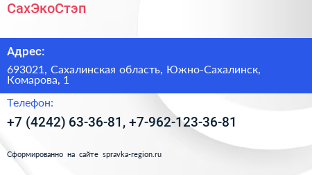 СахЭкоСтэп по адресу 693021, Сахалинская область, Южно-Сахалинск, Комарова, 1 в дальнейшем Организация, размещена в следующих категориях: