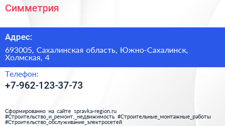 Симметрия по адресу 693005, Сахалинская область, Южно-Сахалинск, Холмская, 4 в дальнейшем Организация, размещена в следующих категориях:
