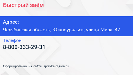 Быстрый заём по адресу Челябинская область, Южноуральск, улица Мира, 47 в дальнейшем Организация, размещена в следующих категориях: