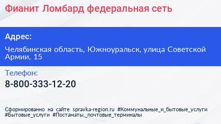 Фианит-Ломбард, федеральная сеть по адресу Челябинская область, Южноуральск, улица Советской Армии, 15 в дальнейшем Организация, размещена в следующих категориях: