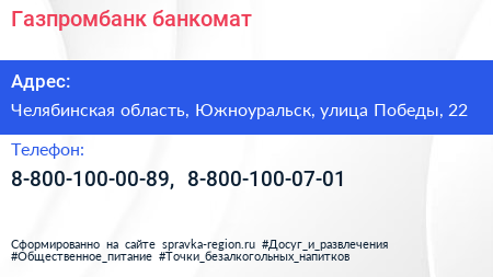 Газпромбанк, банкомат по адресу Челябинская область, Южноуральск, улица Победы, 22 в дальнейшем Организация, размещена в следующих категориях: