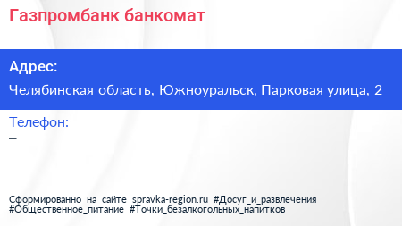Газпромбанк, банкомат по адресу Челябинская область, Южноуральск, Парковая улица, 2 в дальнейшем Организация, размещена в следующих категориях: