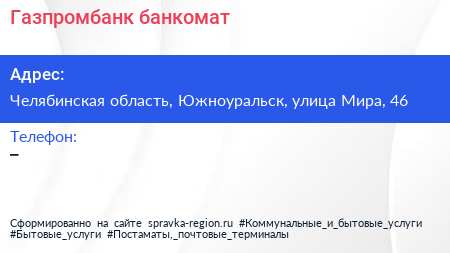 Газпромбанк, банкомат по адресу Челябинская область, Южноуральск, улица Мира, 46 в дальнейшем Организация, размещена в следующих категориях: