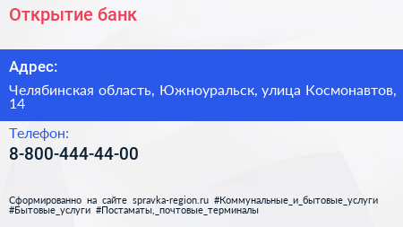 Открытие, банк по адресу Челябинская область, Южноуральск, улица Космонавтов, 14 в дальнейшем Организация, размещена в следующих категориях: