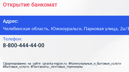 Открытие, банкомат по адресу Челябинская область, Южноуральск, Парковая улица, 2а/1 в дальнейшем Организация, размещена в следующих категориях: