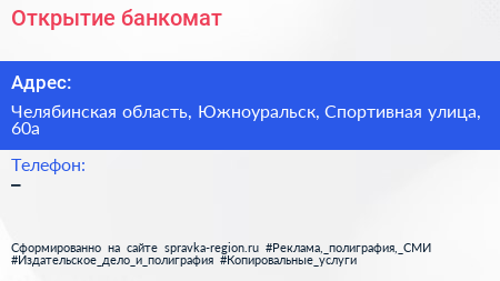 Открытие, банкомат по адресу Челябинская область, Южноуральск, Спортивная улица, 60а в дальнейшем Организация, размещена в следующих категориях: