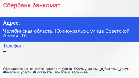 Сбербанк, банкомат по адресу Челябинская область, Южноуральск, улица Советской Армии, 16 в дальнейшем Организация, размещена в следующих категориях: