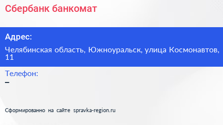Сбербанк, банкомат по адресу Челябинская область, Южноуральск, улица Космонавтов, 11 в дальнейшем Организация, размещена в следующих категориях: