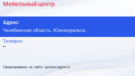 Мебельный центр по адресу Челябинская область, Южноуральск, в дальнейшем Организация, размещена в следующих категориях: