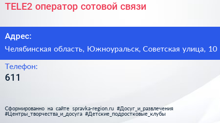 TELE2, оператор сотовой связи по адресу Челябинская область, Южноуральск, Советская улица, 10 в дальнейшем Организация, размещена в следующих категориях: