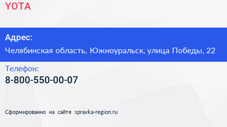 YOTA по адресу Челябинская область, Южноуральск, улица Победы, 22 в дальнейшем Организация, размещена в следующих категориях: