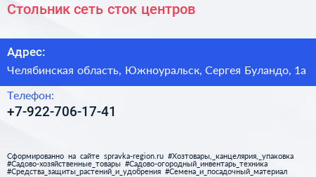 Стольник, сеть сток-центров по адресу Челябинская область, Южноуральск, Сергея Буландо, 1а в дальнейшем Организация, размещена в следующих категориях: