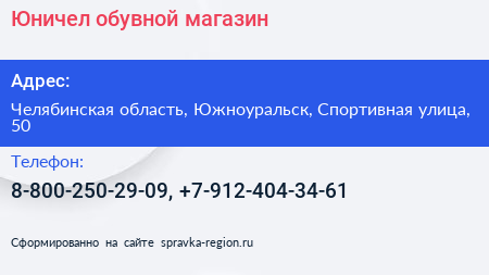 Юничел, обувной магазин по адресу Челябинская область, Южноуральск, Спортивная улица, 50 в дальнейшем Организация, размещена в следующих категориях: