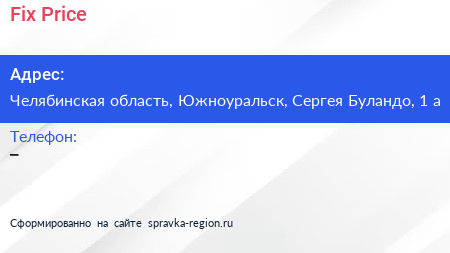 Fix Price по адресу Челябинская область, Южноуральск, Сергея Буландо, 1 а в дальнейшем Организация, размещена в следующих категориях: